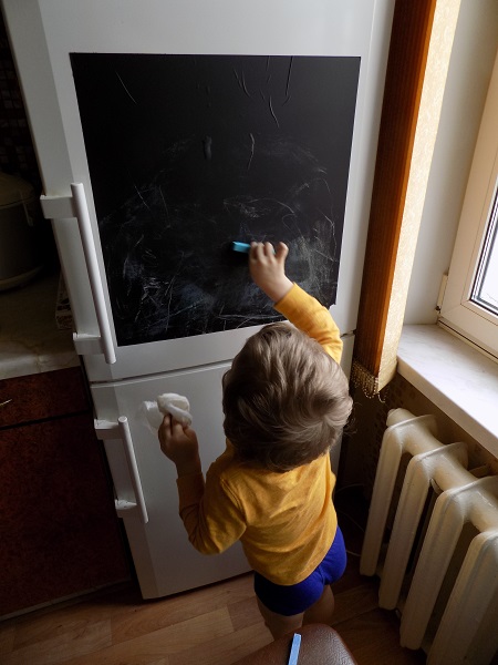 Теперь и мы рисуем в кухне на холодильнике. )) Единственное но, приклеить без пузырей у меня не вышло, а при отклеивании полотно начинает растягиваться. Да и бог с ним в общем-то, главное сын доволен. Мелки немного царают поверхность, но это не страшно.