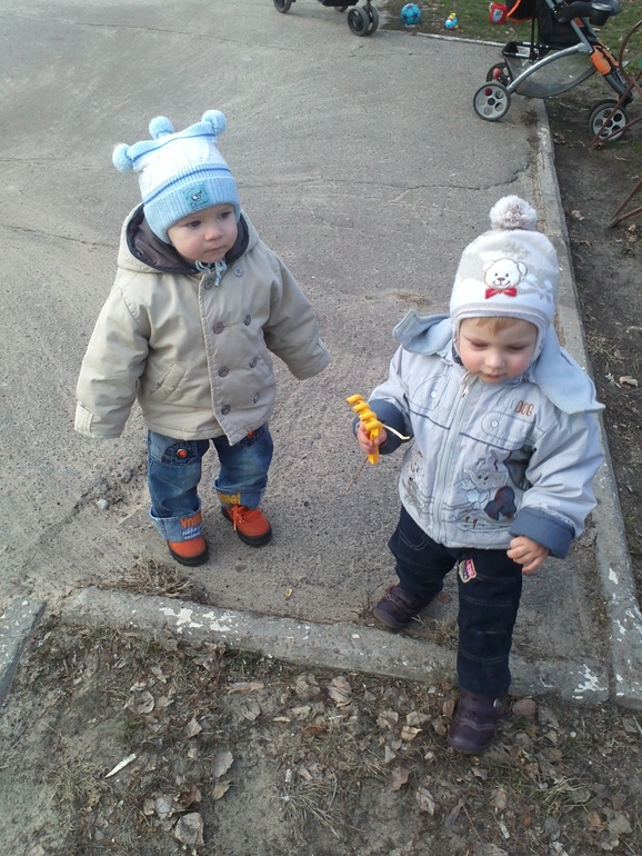 Уже полюбил братика(троюродного), начинают бесится и играть с ним.Раньше они друг от друга находились на расстоянии, а теперь любят вместе бегать и прыгать.В период дождей, ходили друг к другу в гости, там ребятишки так набегивались, что Женька засыпал без задних ног в коляске, по пути домой....