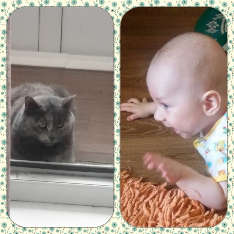 Это Егор ползет к кошке. Какие разные эмоции у них.
