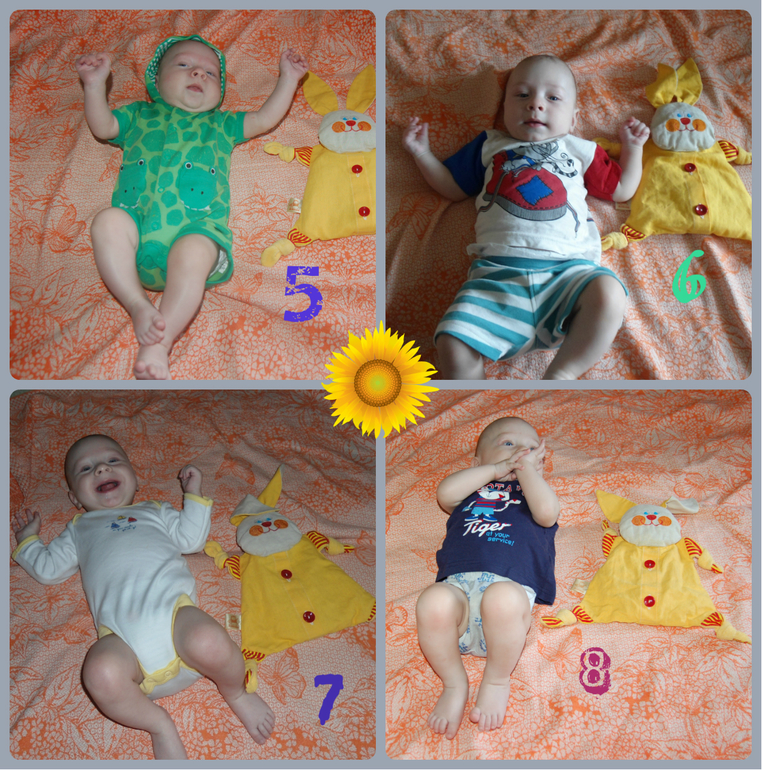 Параметры. Рост у нас 69 см (+23 от рождения), вес в этом месяце топчется на месте также как и в 7 месяцев - 6800 (+4300 от рождения). Думаю вес встал из-за болезни (мы там немного потеряли) и из-за возросшей активности.