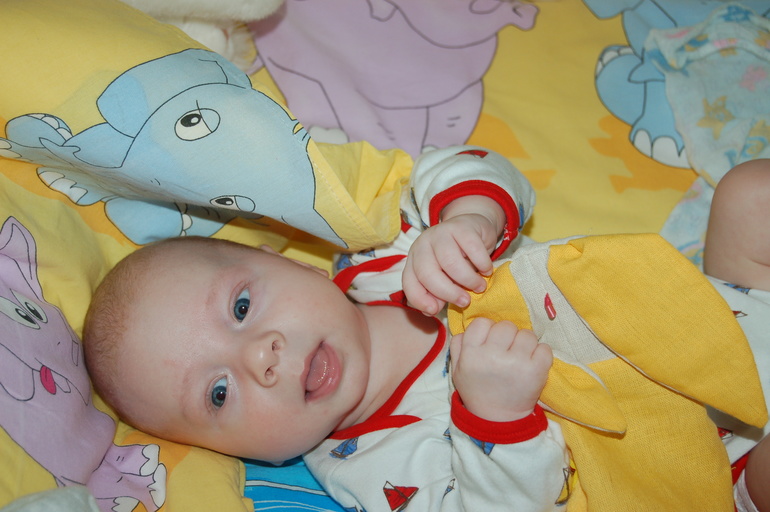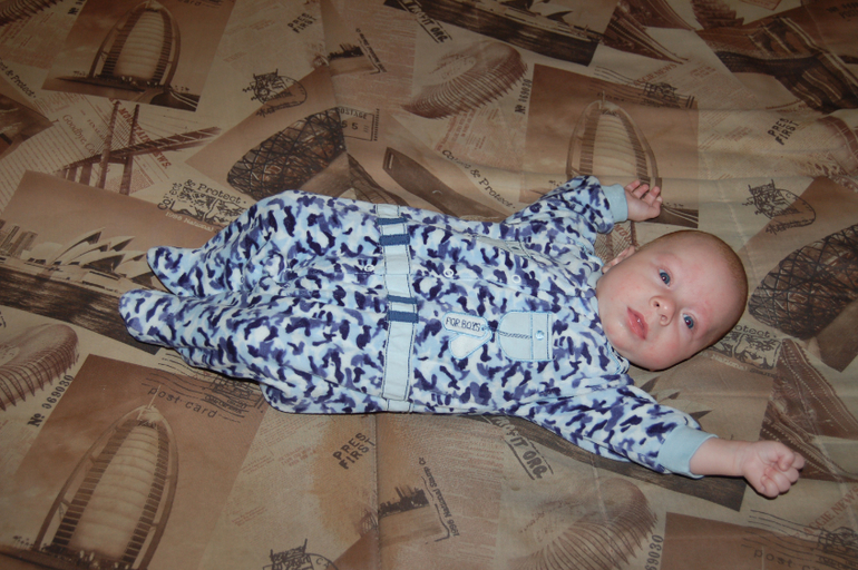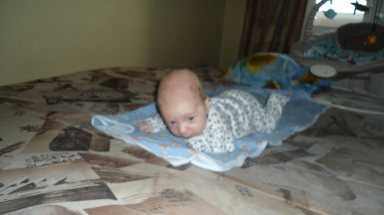 Сегодня, практически в 3 месяца, Егор перевернулся с живота, на спину. Положила его на животик на диване, а он раз и оттолкнулся на ручках и перевернулся на бочек и тут же на спину. Мне кажется он сам не понял как это произошло, но начало положено!