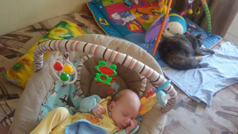 Есть стол, на него постелен матрасик. Стол имеет ограничения в виде стен, окон с 3х сторон, т.е. пока мы не умеем ползать вполне безопасное место.