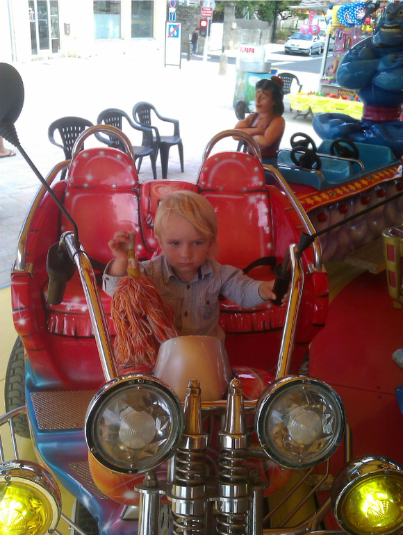 Нашему карусельному месье я очень благодарна, вот такие люди и должны работать с детьми - он нас уже хорошо знает и, по условленному между нами знаку, сам снимает Антуана с карусели и сдает нам - увещевая его, что на сегодня всё! А еще он частенько кидает Антуану в руки заветный помпон (там надо ловить помпон, и кто поймает, тот следующий круг катается бесплатно, а мой дурилка ловить не умеет). И тогда Антуан гордо едет и держит эту мочалку на вытянутой руке!