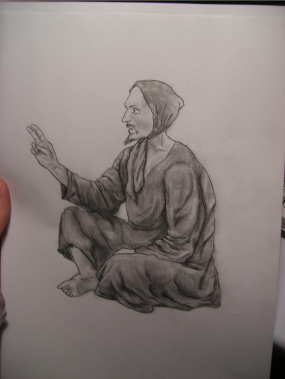 Обе срисованы (я только так умею), первая - французское кафе, а на второй немного измененный юродивый с картины про боярыню Морозову (я того просто взяла за основу, но мне хотелось, чтоб мой был не просто дурачок, а наоборот мудрец, хотелось, чтобы у него были умные глаза). Кафешка нарисована пастелью, а юродивый карандашом. Еще я любила рисовать гелевой ручкой, но показать нечего.