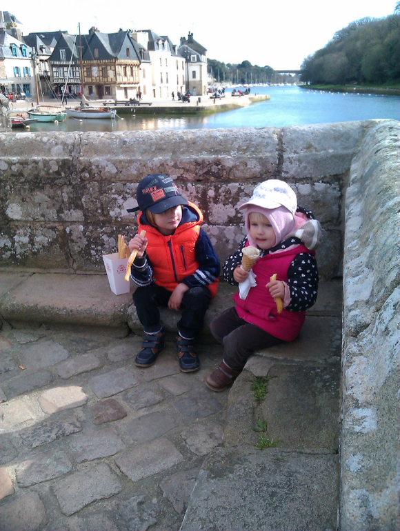 У нас были детские каникулы, я с детьми обалдела уже, где мы только ни были. Но старались хорошо проводить время, а погода подфартила, было 20 градусов, голубое солнечное небо все каникулы, и мы много путешествовали, пикниковали в скалах и у воды, и даже делали туризм, втроем в компании с моими малышами спускались в черные, темные катакомбы первой мировой войны, где были злостно убиты и брошены 50 французских солдат, обнаруженных только после окончания войны, посетили военно-морскую базу. * Один раз мы по мелководью зашли на островок в море, стали там играть, как вдруг я увидела подозрительно быстро набегающую рябь, волночки со стороны моря. Мы сразу пошли назад на берег и успели выйти ровно за пару минут до прилива (риска не было, успели бы и через 5 минут, только бы промокли). Но было как всегда впечатляюще, как наш островок скрылся полностью, и вскоре море пришло, и будто ничего и не было. * Для детей были на мини-спектакле про пиратов с жонглерами и тп. Мы приезжали в незнакомый город, заходили в офис туризма, брали карту и ходили там - я купила себе рюкзак. Лиза в ужасном кризисе НЕТ снова обострение, просто ужас, но зато туристка с нами наравне, никакой коляски у нас давно в помине нет, ходили целыми днями, а ей лишь бы еще. * Я купила себе приспособления для йоги, теперь разогнуться не могу, кажется перетянула чего-то. Аа, еще я почти научилась прыгая на батуте делать сальто через голову. Вот подходящее занятие для тетки к 40ка годам - учитсья прыгать на батуте сальто! * Вчера подружка передала мне через мужа (наши мужья работают вместе) букет цветов из ее сада, очень приятно. Вот так обо всем. А у вас что да как?!