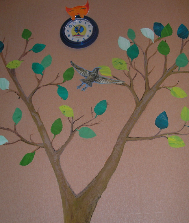 А у нас дома "растет" вот такое дерево) Зимой оно все было в снежинках, весной- в цветах, сейчас в красивом зеленом уборе, к осени яблочки появятся, а уж осенью соберем красивые желтые листья и приклеим)