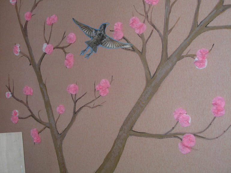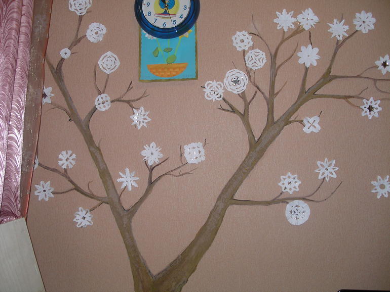 Подскажите на булавках держатся листья, цветы и снежинки? Дерево нарисовано на обоях или я ошибаюсь?