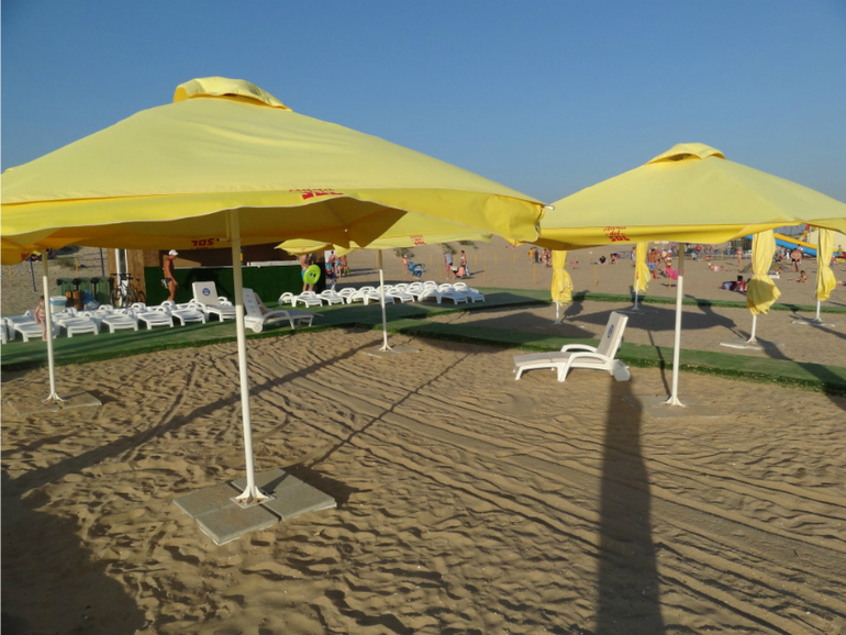 собственный,песчный, оборудованный в 300 метрах от отеля. Лежаки и зонтики входят в стоимость проживания. На пляже