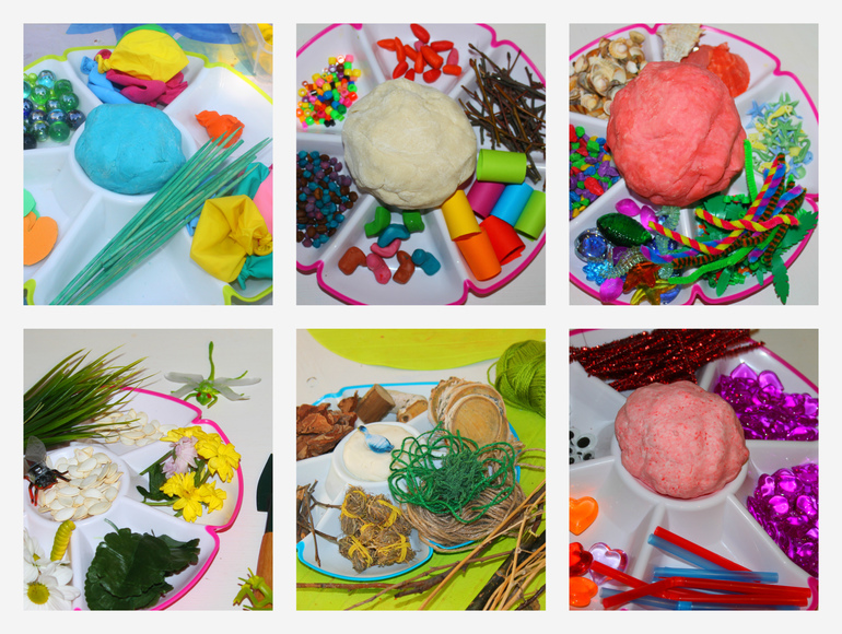 Идея проста до невозможности- в ячейках выкладываем разные нужные,конечно же, штуки -аксессуары для лепки. Это могут быть камни,ракушки,нитки,палочки,шишки,мелкие игрушки, тематические вещицы или просто,что на глаза попадется,а в середину менажницы кладем кусок пластилина/теста/субстанции для лепки.