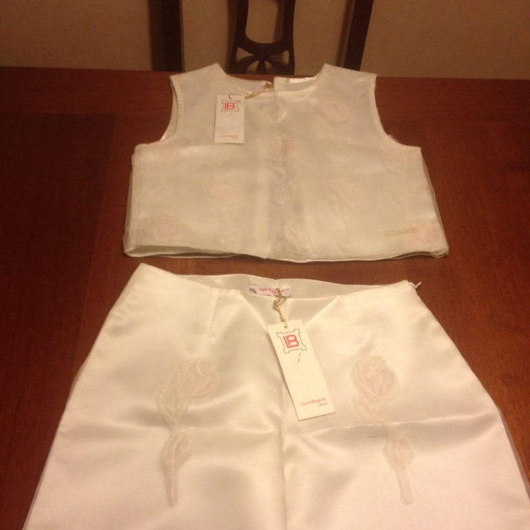 Двухслойный, очень нежный и нарядный - топик на молнии по спинке+клешные брюки. На верхнем белом слое органзы нежно-розовые розы, нижний слой - атласный.