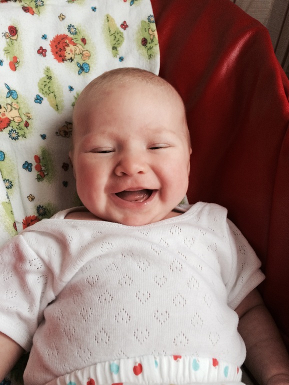 Оля уже хорошо держит голову, любит ходить столбиком. Много улыбается и смеется, осознанно агукает в ответ на голос. Любит слушать погремушки и смотреть черно-белые картинки.