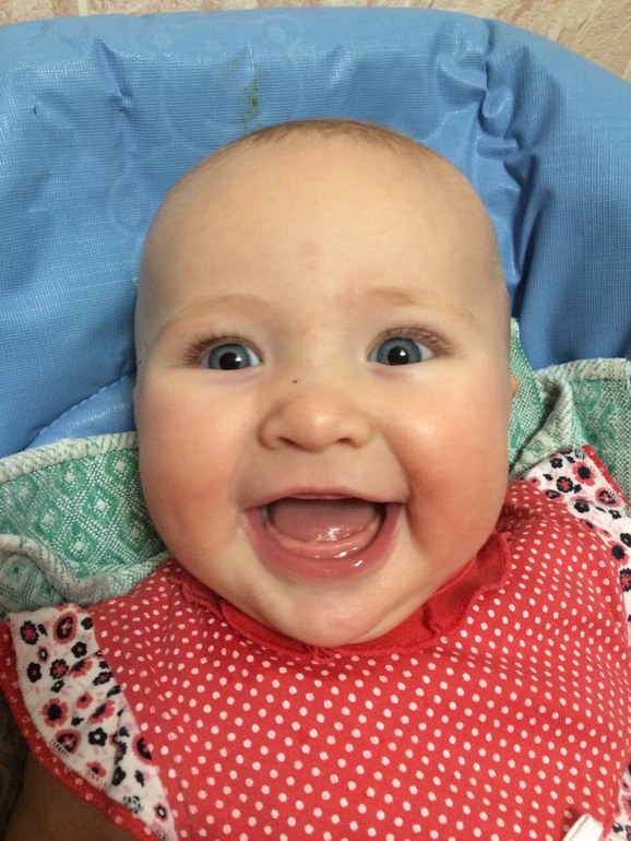 Она свет в окошке, улыбчивая, игривая, разговорчивая. любит внимание. Очень активно переворачивается и ползает задом по-пластунски, делает попытки встать на колени, но пока не очень удачно. Громко верещит, когда чего-то требует и просто от восторга.
