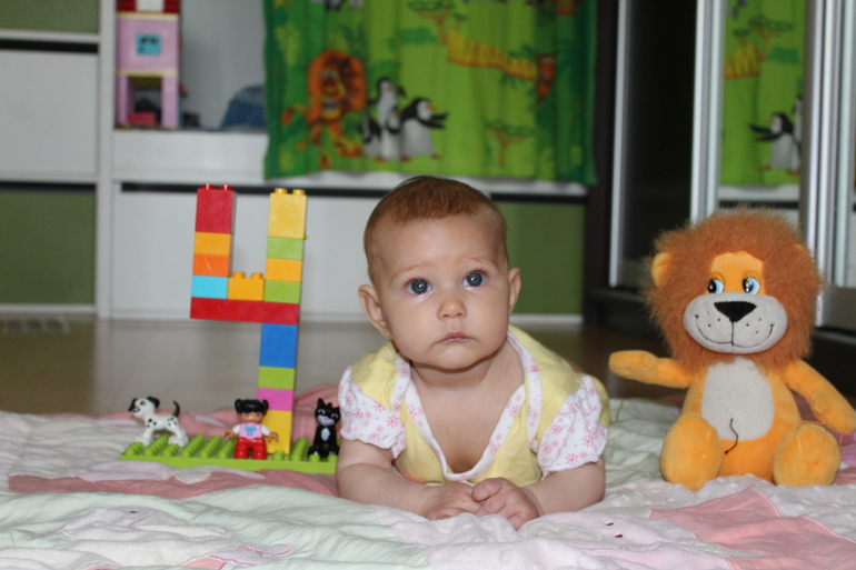 За этот месяц Маха( как зовет ее Гена) заметно изменилась. Стала переворачиваться со спины на живот. Пару раз перевернулась обратно, но я думаю, случайно. Стала опираться на ручки лежа на животе, но пока слабовато и недолго. Встает на колени и даже ночь. ползает вокруг себя, неплохо так перемещается по комнате. Начали половую жизнь. Так на коврике уже не удержать. Любит купаться с кругом. кстати, в прохладной воде, барахтается и довольно визжит. Не, не так! ВИЗЖИТ!!! в шутку зовем ее птеродактилем. Поет песни и лепечет по настроению. ДО последних двух дней был приличный режим со самостоятельным сном в кроватке и самостоятельным засыпанием. НО видимо регресс сна существует и уже третий день, спит плохо, часто просыпается, горько рыдает и не может сама заснуть. Начинаем все сначала. Для меня вообще сон, особенно ночной, очень важен. Для меня прям трагедия, что она не спит. НО приучим, что ж делать. Кстати, переходит на три сна. Трудное это дело.