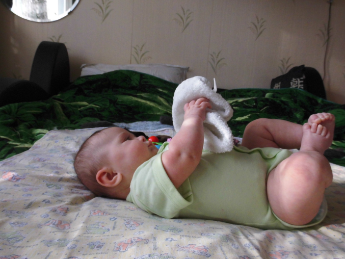 Живо интересуется всякими новыми предметами (баночками, бутылочками, тряпочками).