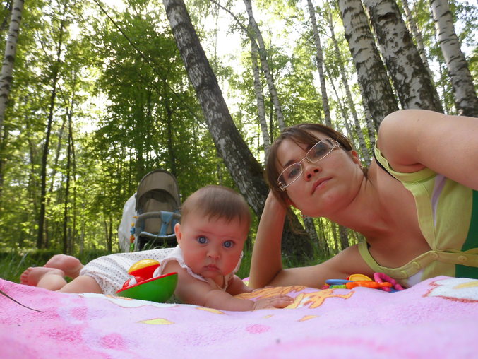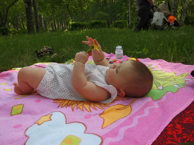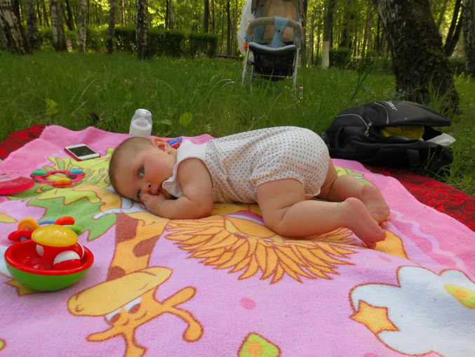 Вообщем, отдохнули и погуляли просто супер))) Правда настроение подпортили одна дотошная тетя (пыталась убедить меня, что такой малышке холодно на земле, мои доводы, что два одеяла и я сижу и холода вообще не ощущаю, и вообще, мы уже так гуляли на нее не действовали, вынесла мозг) и дождик, который внезапно начался, пришлось забираться в коляску и стоять под деревом))))