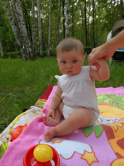 А еще, Настена пытается сидеть, с поддержкой, за одну ручку. Говорю сразу, мы так сидим совсем по чуть-чуть буквально пару секунд)))) я знаю, что пока сама не сядет, лучше не сажать, но ей очень нравится, я иногда присаживаю ее))))