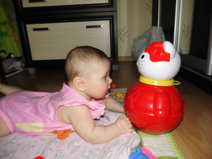 И главное, ничего ей не даю просто так, хочет погремушку, пусть тянется, хоть чуть-чуть, перевернуться тоже только ножку помогаю, остальное жду пока сама сделает, будем наеятся, что наша красотка перестанет чувствовать себя барыней и зашевелится более активно.