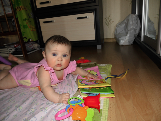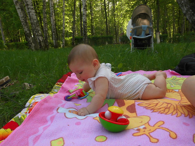 Уже несклько дней как стала замечать, что у дочки меняется режим дня. "Большой" дневной сон сократился до 2 часов максимум и то постоянно просыпается, с чем это связано я пока не пойму. думаю есть смысл начинать перебираться с балкона в кроватку. Правда пока не решила, как наименее болезненно это сделать. Однозначно стала интересоваться "человеческой" едой, постоянно заглядывает мне в рот))) Мы окончательно и бесповоротно перебрались на пол и даже убрали одеяло, второй день Настена ползает просто по ламинату. Меня немного беспокоит, что пол твердый, она уже пару раз ударялась лбом, но думаю, чем скорее сообразит, тем быстрее привыкнет. Настена уже перемещается в радиусе 2-2,5 метра, я не могу сказать, что она ползает в прямом смысле, НО.. она катается, и назад ползет (поэтому одеяло и убрали, она с него уползает), Мне очень хочется, чтобы она уже поползла хорошо и села)))) но, понимаю, что торопить нельзя, и только на личном примере и заманивая))))