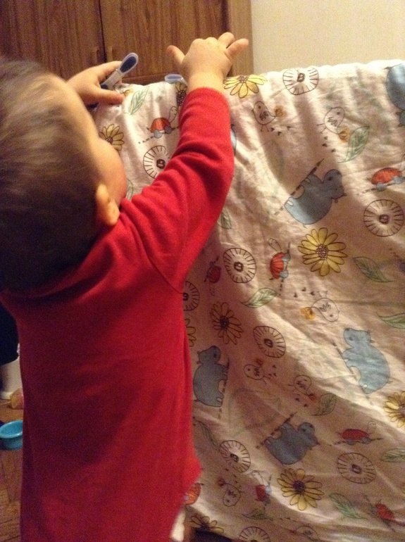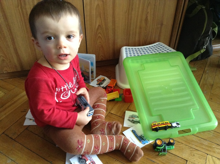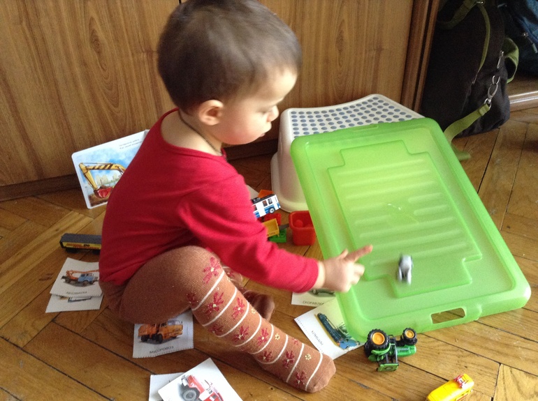 Прищепки просто стаскивали, сортирую я; автопарк пускали по горке, называли машинку, изображали ее звук, посмотрели карты, книги про машинки
