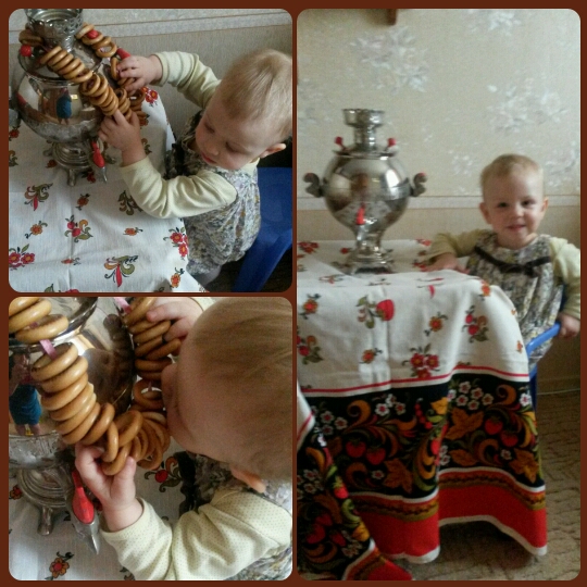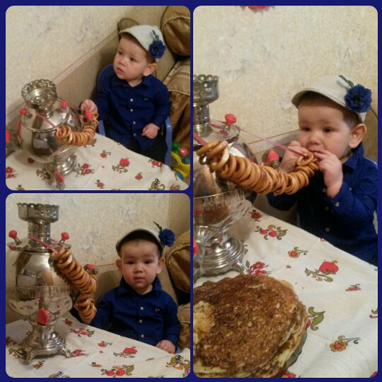 с Викулей . Вчера быстренько смастерила кокошник и Максиму шапульку из папиной кепки.