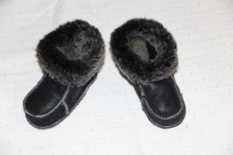 Новые меховые пинетки, внутри натуральная овчина, снаружи - как "облитая" дубленка, с небольшим блеском. Отделка - искусственный мех. На ножку 11-12см.
