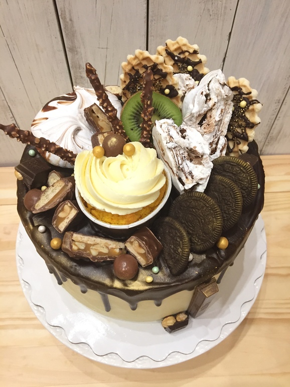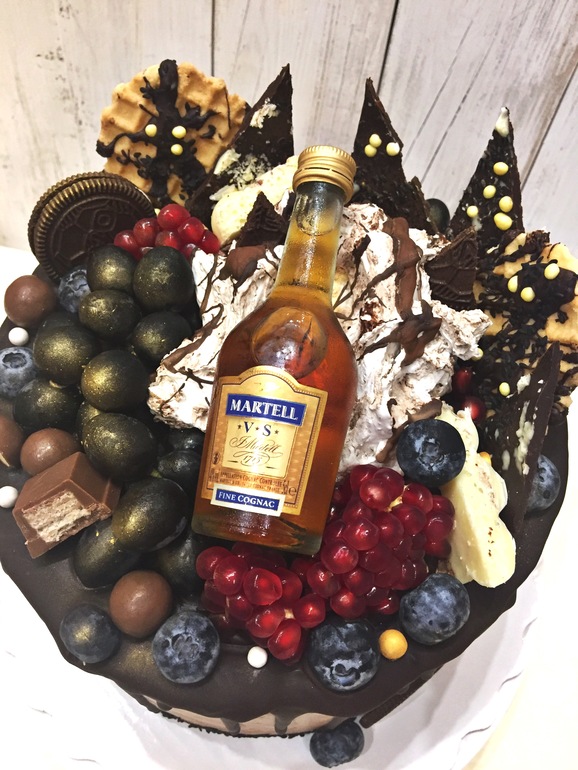 Медовик с вишней,карамелью,орешками и сливочно-сметанным кремом. Украшен сильно и по-мужски;)))