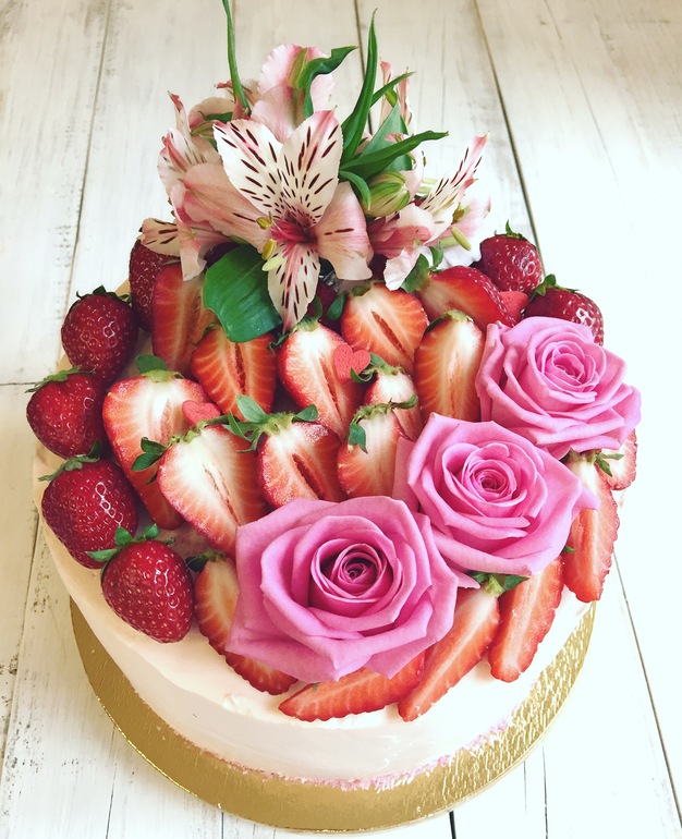 Альстромерии в букетике, венок из розочек и клубника, внутри нежный сливочный с малым содержанием сахара.