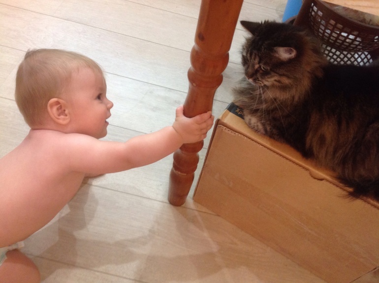 Мы начали наконец самостоятельно сидеть, ползаем все также по пластунски, но очень уверенно стоим на четвереньках, пытается встать у опоры. Передвигаемся пере катками очень быстро)