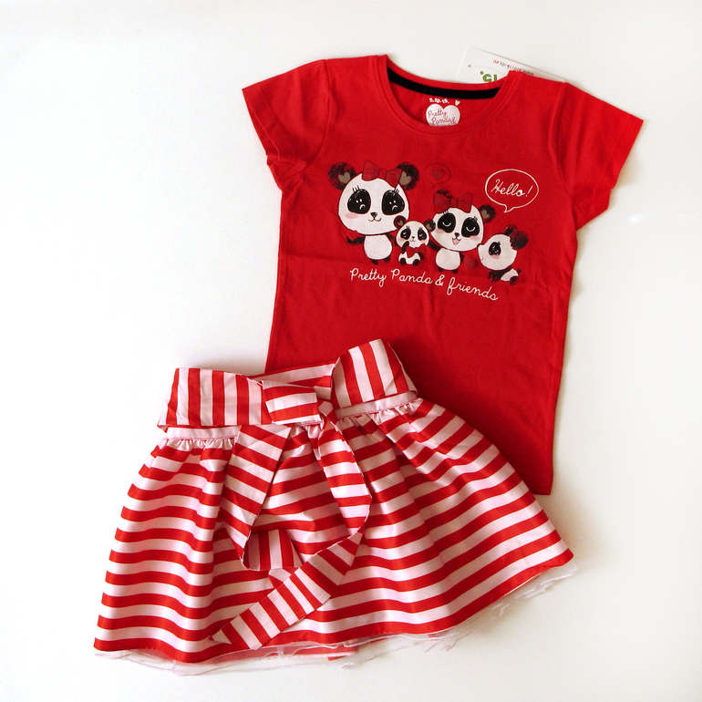 Пышная юбочка в полоску (светлая полоса не кипельно-белая, а с розоватым оттенком), на резинке, есть пояс, который можно завязать на бант, подкладка понизу украшена фатином, что придает юбке дополнительную пышность, рост 110 (юбка большемерит на размер), состав 100% ПЭ, цена - 300 р. Яркая футболочка с веселым принтом, бантики у панд и сердечки - блестящие, рост 116, цена - 300 р.