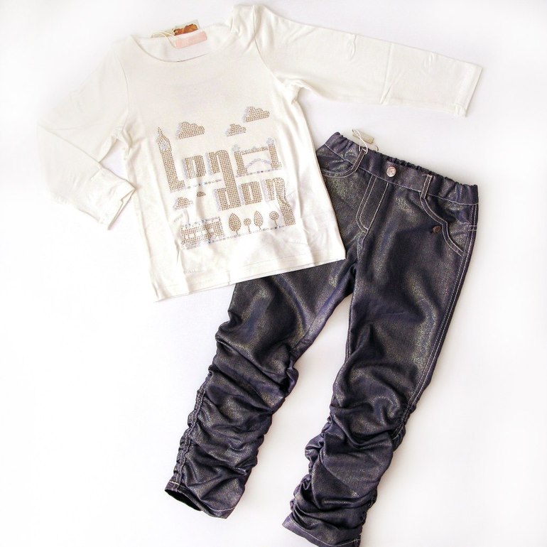18. Комплект - стильные джинсы из хлопка с золотистым блеском, присборенные по бокам и молочный лонгслив из вискозы с эластаном, украшенный россыпью страз, размеры: 2-3 годика (98 см), 6-7 лет (122 см). На мой взгляд, вещи большемерят. Смотрится очень стильно, отлично подойдет на НГ. Цена: джинсы - 690 р, лонгслив - 750 р
