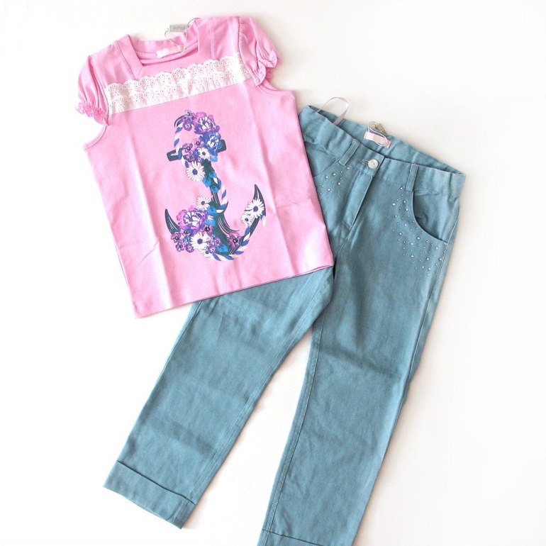 16. Комплект - стильные бриджи из тонкой джинсы и футболка с принтом и шитьем, размеры: 3-4 года (104 см), 6-7 лет (122 см), 7-8 лет (128 см)