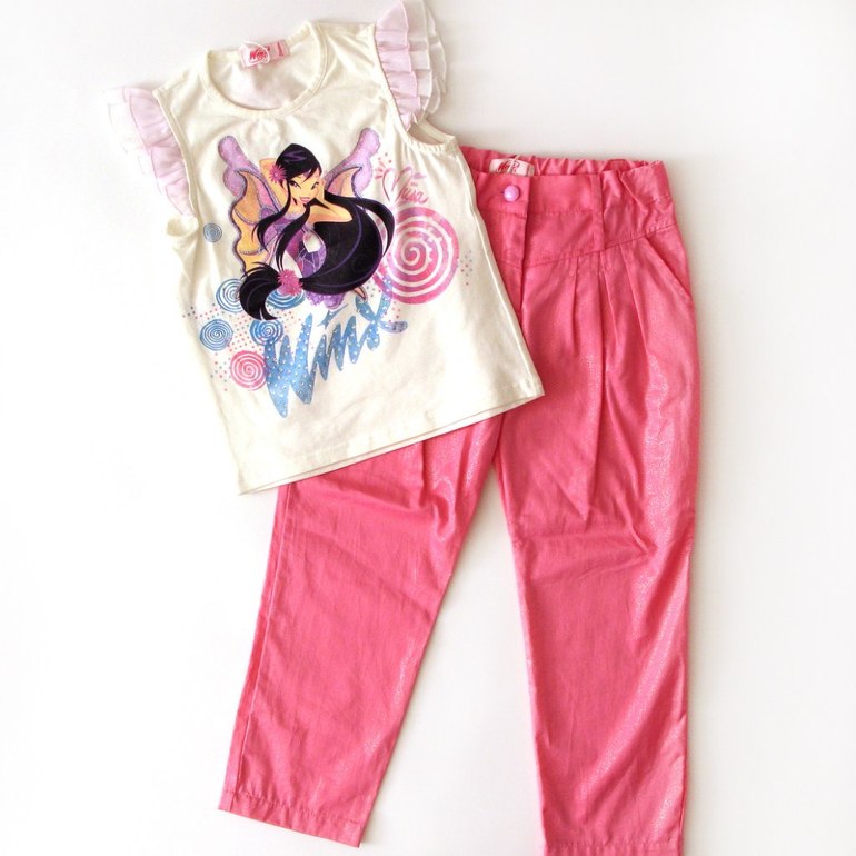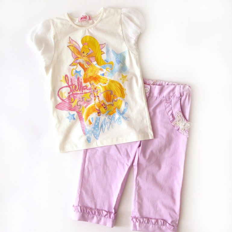 Цена: бриджи - 590 р, футболка - 470 р17. Комплект Choupette Winx на 5 лет (110 см) - футболочка с легкими шифоновыми рукавчиками-фонариками, украшенная принтом и стразами и бриджи (на поясе есть утяжка), цена: бриджи - 590 р, топ - 550 р