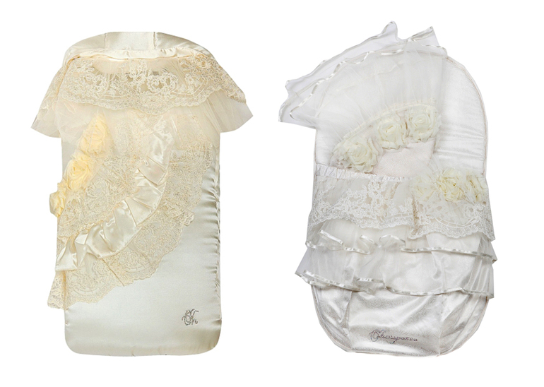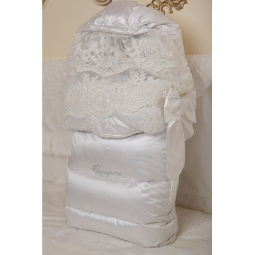 Утепленный конверт "Ампир" - теплый конверт для выписки из роддома и прогулок в коляске. Снабжен внутренним клапаном для защиты от ветра, дополнительной фиксации, и еще большего комфорта малыша. Имеет застежки-молнии и съемную кружевную вуаль, декорирован итальянским кружевом, розами из вуали и монограммой из страз. Выполнен из натурального хлопка и шелка. Состав: 100% шелк, 100% хлопок. Наполнитель: 450 г/м холлофайбер. Цена: 4500 р. Конверт упакован в фирменную коробку.