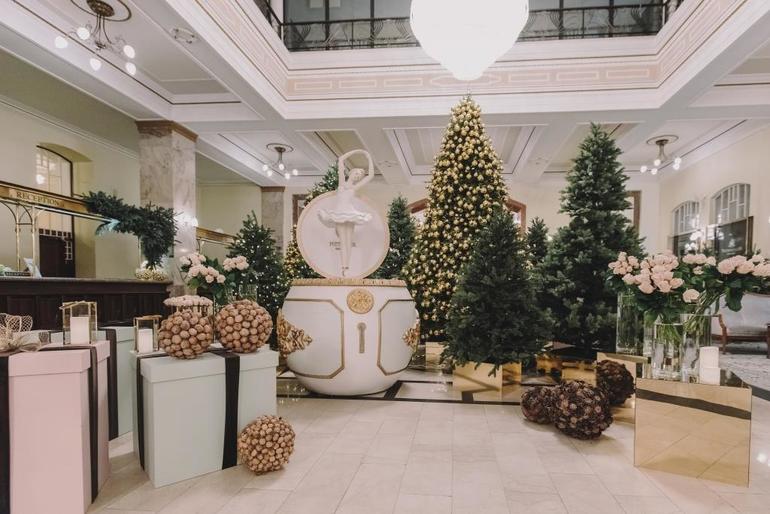 Центром рождественской композиции в отеле стала большая музыкальная шкатулка с балериной, окружённая подарками и елками. Новогодний декор лаконично вписался в уже имеющийся роскошный интерьер отеля и придал ему нарядный, праздничный вид. На столах, тумбах, подоконниках расставлены композиции из веток, шишек и свечей, а также икебаны из белых сухих веток с фаленопсисом. Яркие новогодние перламутровые и матовые шары золотистого цвета украшают хвойные деревья. Игрушечная железная дорога с паровозом и вагончиками, проносящимися вокруг елок в ресторане Метрополь, возвращает в детство. Детская игровая зона оформлена в белых тонах и наполнена небольшими фигурками животных, искусственными безе и сахарной ватой.