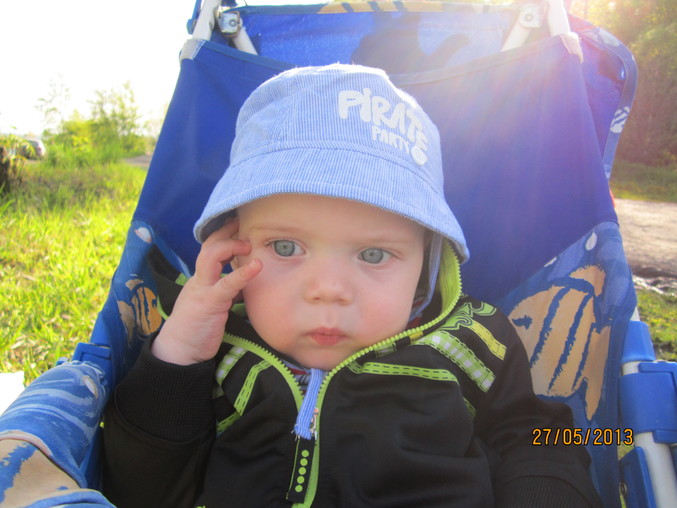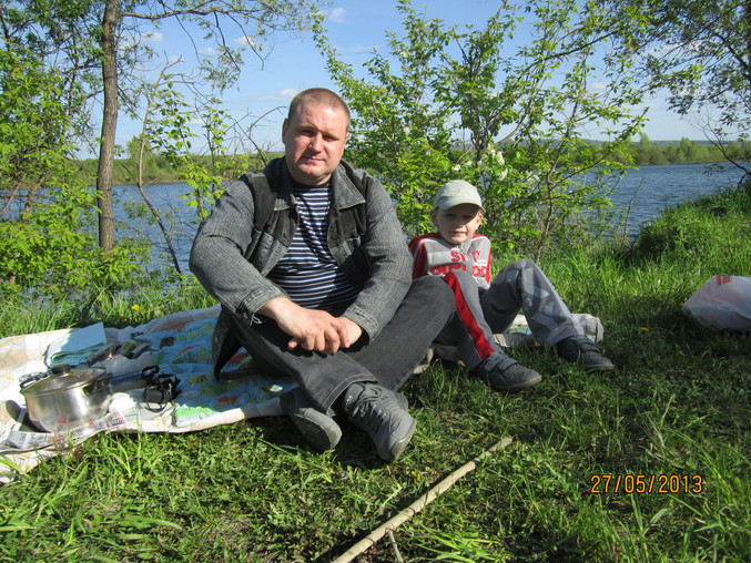 Ждем с Артемкой, пока папка разведет огонь. Малыш в это время спит в машине.