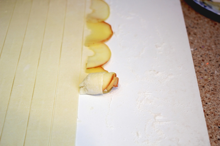 Выложить яблочные пластинки на полоски слоеного теста. Свернуть рулетиком