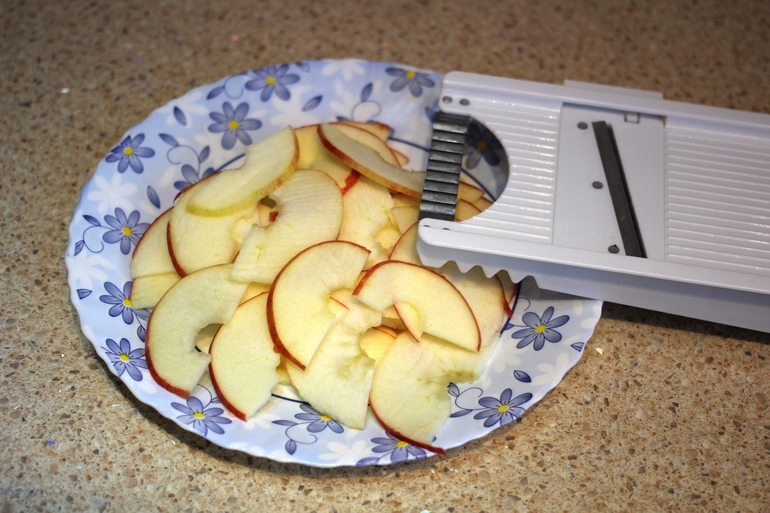 Из яблок вынуть сердцевину, порезать тонкими пластинами