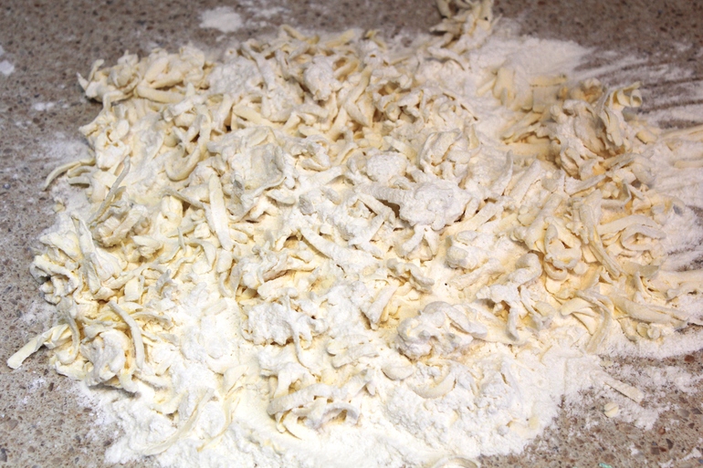Натереть сливочное масло на терке, добавить 3 стакана муки. Разбить яйцо в стакан, долить воды, чтобы получилось полстакана. Соединить все компоненты и замесить тесто.