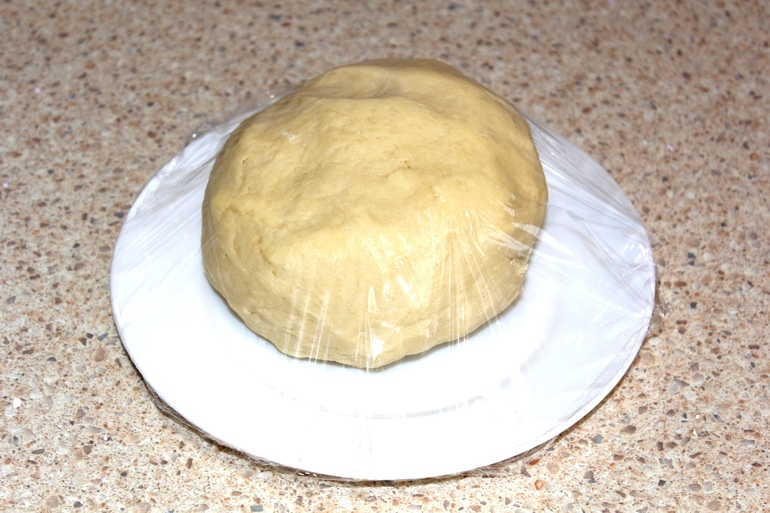 Тесто раскатать в жгут, разделить на 6 равных частей, покрыть пищевой пленкой, отправить в холодильник на 30 мин.