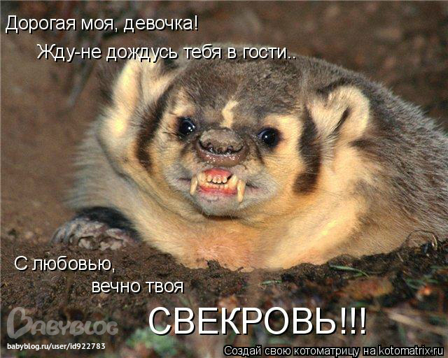 А у меня со свекровью отношения хорошие)))) она всегда говорит "Я люблю свою невестку,потому что она любит моего сына!!!!"