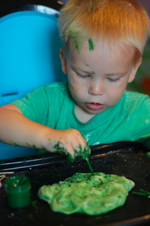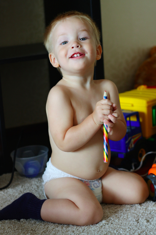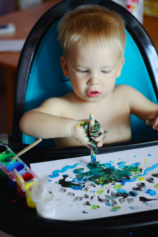 Мы организовали для него рабочий уголок - стол, стульчик, лампочка. Там он обычно рисует, потому художественные принадлежности пока оттуда не убираю - стоят карандашницы с цветными карандашами, восковыми мелками, ручками. Фломастеры выдаю только под присмотром, переживаю за квартиру. Рисовать он очень любит, и это то, что он делает в основном без моего участия. Конечно, мы рисуем и вместе, как же без этого. Так же осваиваем аппликации (картон + клеющий карандаш). Часто рисуем красками - кисточками гуашью и пальчиковыми красками руками, ногами и делаем всякие отпечатки того, что подвернется под руку. Лепим из соленого теста, часто и много. В последний раз долго играли в цветной дождь - макали спичку в банку с гуашью и делали ей отпечатки на тесте, потом тесто перемешивали и оно окрашивалось. И так дофига раз.