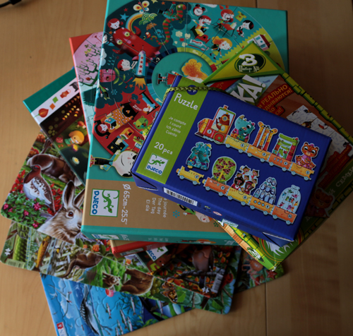 Сразу приучила собирать пазлы обратно в коробку, Алиса как соберет, кричит: "Гугой!!!" (другой), пока не соберет "гугой" не даю)))