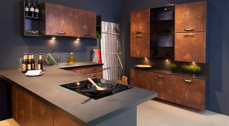 Кухня будет вот с такими фасадами и столешницей и с такими же черными стеклянными шкафами: