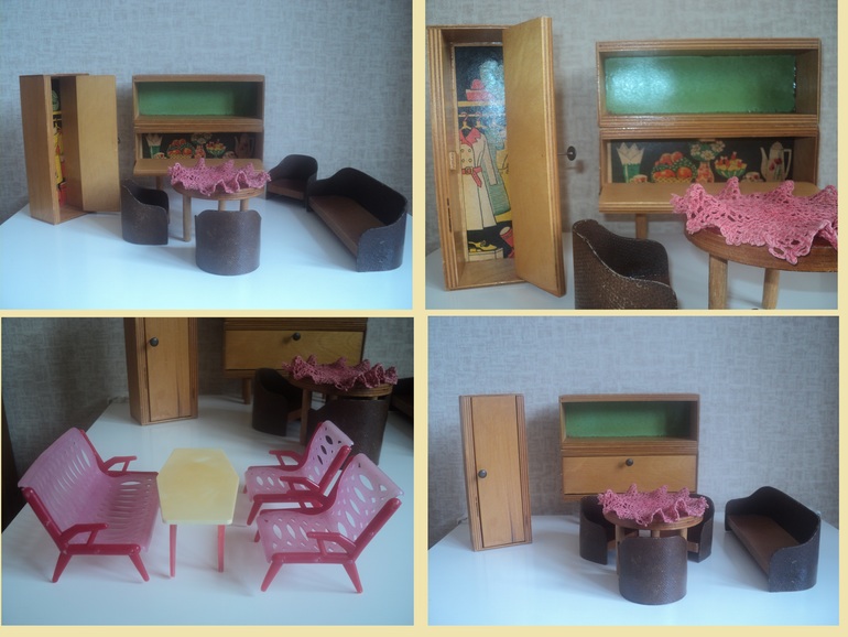 Ну а интерьер - советская кукольная мебель из моего счастливого детства! Как же я обожала играть в домики! Часами засиживалась .....она мне очень дорога! и никакие современные красивые пластики не сравнятся! Поэтому очень берегу её и дорожу, и детей приучаю- поиграли,собрали в коробку и убрали до следующего раза)))
