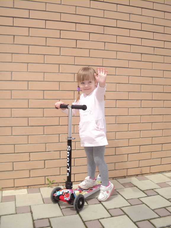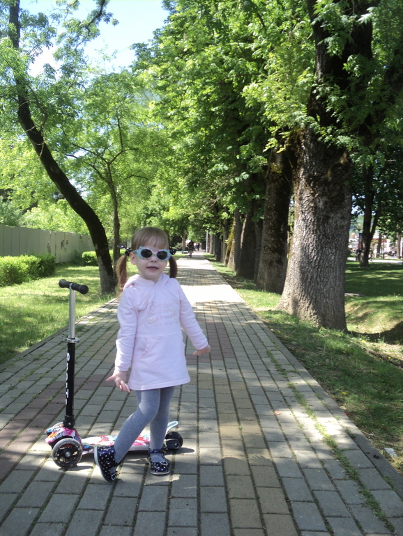 Купили Полинке Самокат! Красивый,со светящимися колесиками и цветомузыкой.Не выпускает его из рук! Даже на качелях каталась вместе с ним...