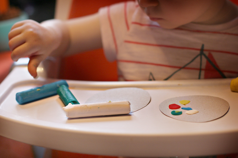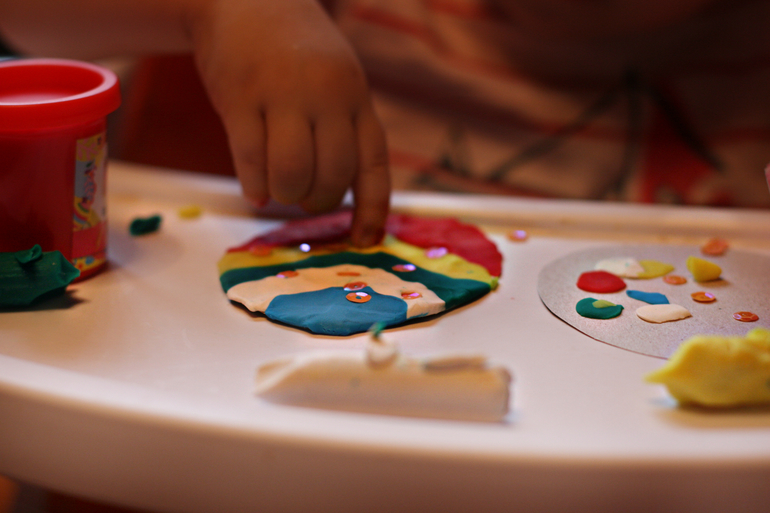 И так, начали мы с того, что на картонные заготовки яиц клеили пластилин и посыпали их всякими подручными сыпучестями. В нашем случае, это оказался крашеный желтый рис, пайетки и упаковочный материал. Делали мы эти яйца два дня, тк Еве быстро надоедало с ними возиться. Что сделала я и что Ева: я вырезала заготовки и помогала дочке более менее ровно клеить колбаски. Ева катала колбаски, мяла и отрывала пластилин, приклеивала его и сыпала красивости. Я только посильнее все прижала к картону, чтоб не отвалилось. В итоге получилось 2 яичка, одно полосатое, а другое пятнистое.