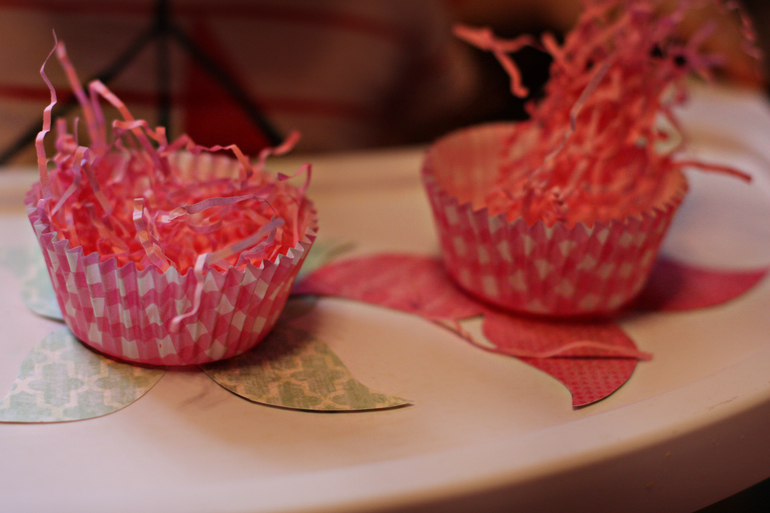 Потом мы сделали подставки под яички в количестве 2 штук. Для этого нам понадобилась скрап бумага, из которой я вырезала основы, формы для капкейков, упаковочный материал в качестве наполнителя и красивости для украшения. Я наносила клей на основы, Ева приклеивала формы и украшения.