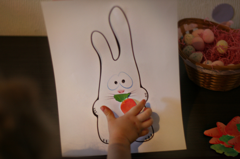 Ну и еще одно не хитрое занятие. Распечатала на листе а4 кролика, вырезала отверстие для ротика и кучу морковок и Ева кормила этого зверя. Это был наш хит недели) И остается до сих пор) Не проходит дня, чтобы Ева не кормила кролика. Я даже немного его усовершенствовала) Лист с кроликом приклеила на банку от спортпита, так он и устойчивее и морковки падают в банку. А морковки приклеила на картон, чтоб не так быстро выходили из строя.