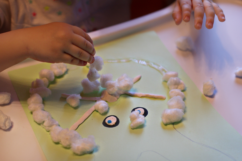 Еще мы сделали пасхального зайца) Для этого нам понадобился лист бумаги, на котором я изобразила очертания зайцевой мордашки, потом мы этот контур залили клеем пва и приклеили ватные шарики. Усы и глазки из пластилина. Тоже очень увлекательное занятие и симпатичный результат: