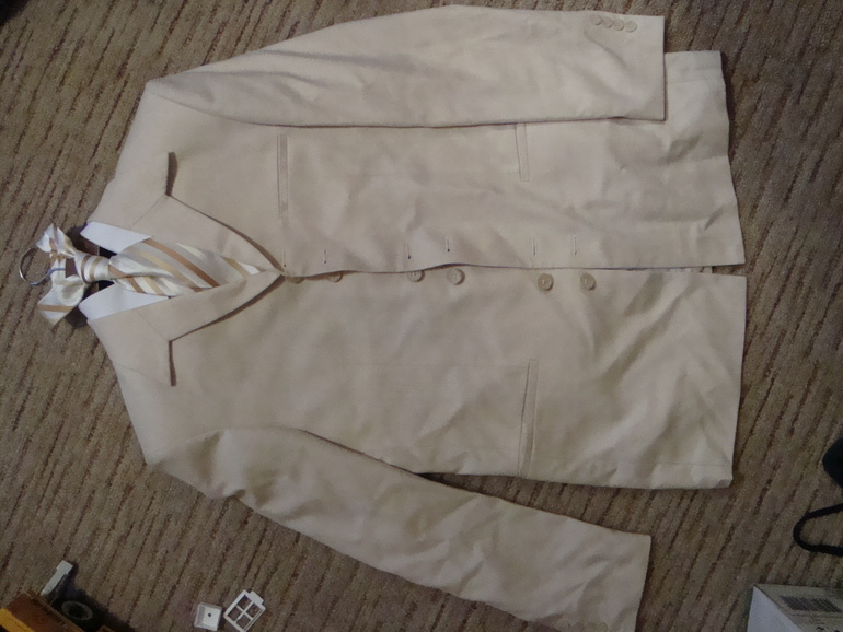 Костюм( пиджак,брюки,рубашка,галстук). Б/у 1раз, состояние отличное, не стирала, в пару местах есть еле заметные пятнышки, я думаю отстираются. Р.48 - 182. Цвет шампань, очень красивый. 7тыс.экв.условно.